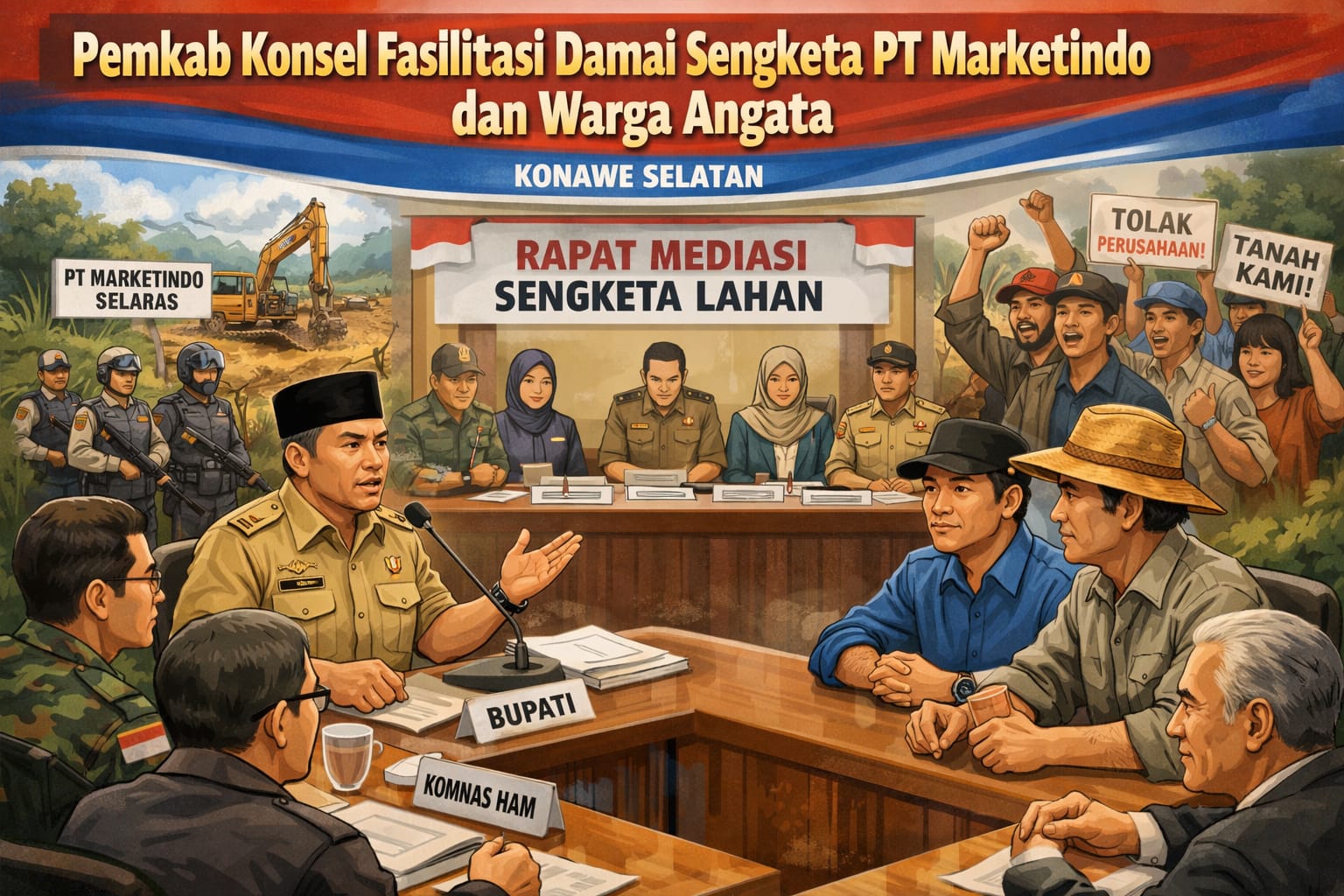 BIKASMEDIA.COM, KONAWE SELATAN – Pemerintah Kabupaten Konawe Selatan menegaskan komitmennya untuk menyelesaikan konflik pertanahan antara PT Marketindo Selaras dan Aliansi Masyarakat Tani Kecamatan Angata secara adil, transparan, serta berlandaskan hukum dan prinsip keadilan sosial.