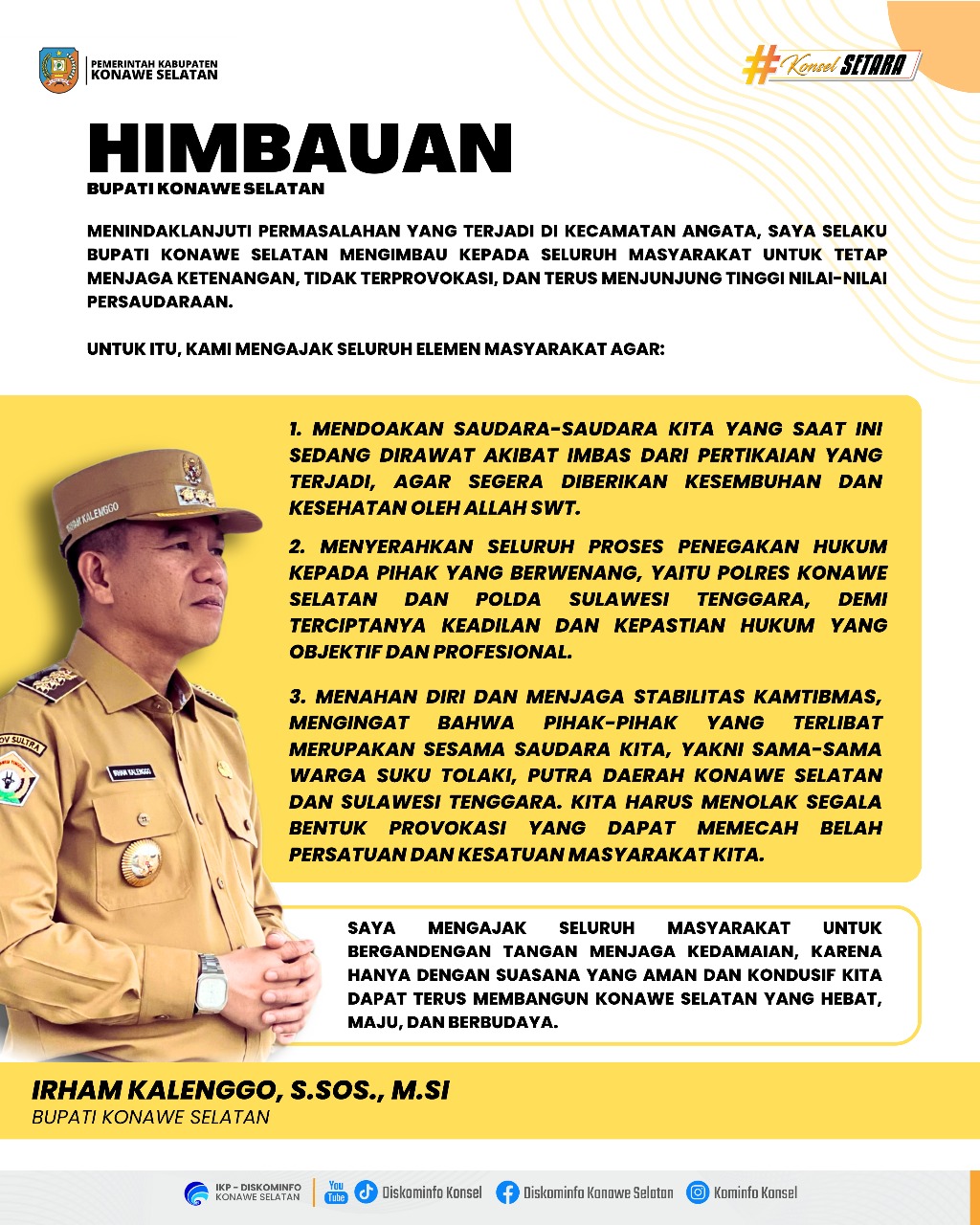 BIKASMEDIA.COM, KONAWE SELATAN – Bupati Konawe Selatan, Irham Kalenggo, S.Sos., M.Si., mengeluarkan imbauan tegas kepada seluruh masyarakat menyusul insiden yang terjadi di Kecamatan Angata pada hari Jum’at, 6 Juni 2025 lalu.