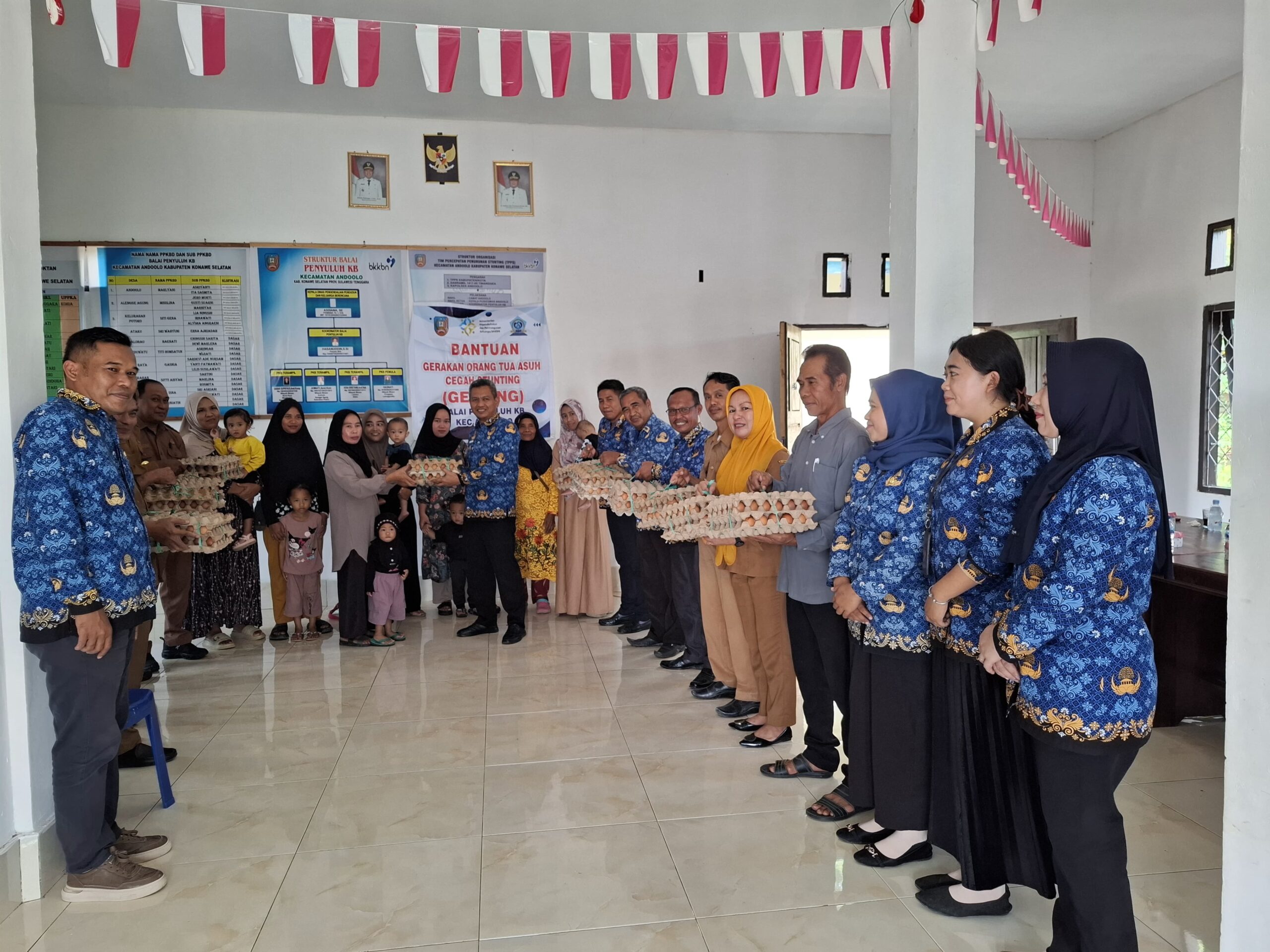 Kegiatan ini dihadiri oleh Camat Andoolo, Kepala Puskesmas, serta seluruh Kepala Desa dan Lurah se-Kecamatan Andoolo yang bertindak sebagai Orang Tua Asuh (OTA). Fokus utama intervensi adalah pemberian bahan makanan bernutrisi tinggi, berupa telur, kepada 12 sasaran keluarga yang memiliki anak berisiko stunting.