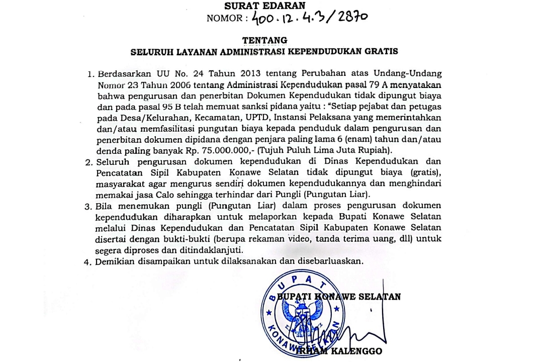 Bupati Konawe Selatan juga mengingatkan bahwa terdapat sanksi pidana berat bagi setiap pejabat dan petugas yang terbukti melakukan pungutan liar (pungli) dalam proses pengurusan dokumen kependudukan. Sesuai Pasal 95B UU Adminduk, “Setiap pejabat dan petugas pada Desa/Kelurahan, Kecamatan, UPTD, Instansi Pelaksana yang memerintahkan dan/atau memfasilitasi pungutan biaya kepada penduduk dalam pengurusan dan penerbitan dokumen dipidana dengan penjara paling lama 6 (enam) tahun dan/atau denda paling banyak Rp.75.000.000,- (Tujuh Puluh Lima Juta Rupiah).”