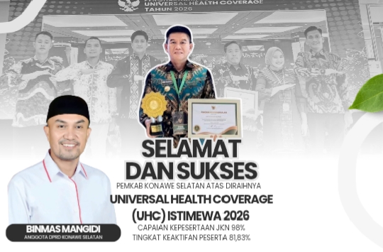 BIKASMEDIA.COM, KONAWE SELATAN – Keberhasilan Pemerintah Kabupaten Konawe Selatan (Konsel) meraih penghargaan Universal Health Coverage (UHC) Istimewa 2026 mendapat sambutan positif dari parlemen. Anggota Komisi III DPRD Konsel, Binmas Mangidi, memberikan apresiasi tinggi atas komitmen Bupati Irham Kalenggo dalam mewujudkan akses kesehatan merata bagi masyarakat.