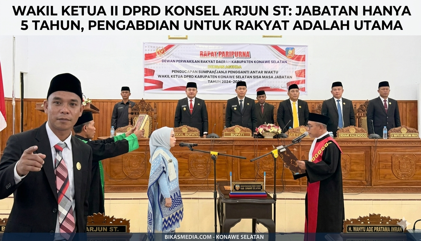 BIKASMEDIA.COM, KONAWE SELATAN – Wakil Ketua II DPRD Kabupaten Konawe Selatan (Konsel), Arjun, ST, menekankan pentingnya integritas dan kerja nyata bagi seluruh anggota legislatif. Hal ini disampaikannya usai menghadiri Rapat Paripurna Pelantikan dan Pengambilan Sumpah Wakil Ketua I DPRD Konsel, Hj. Yuliati, S.Si, Senin (06/04/2026).
