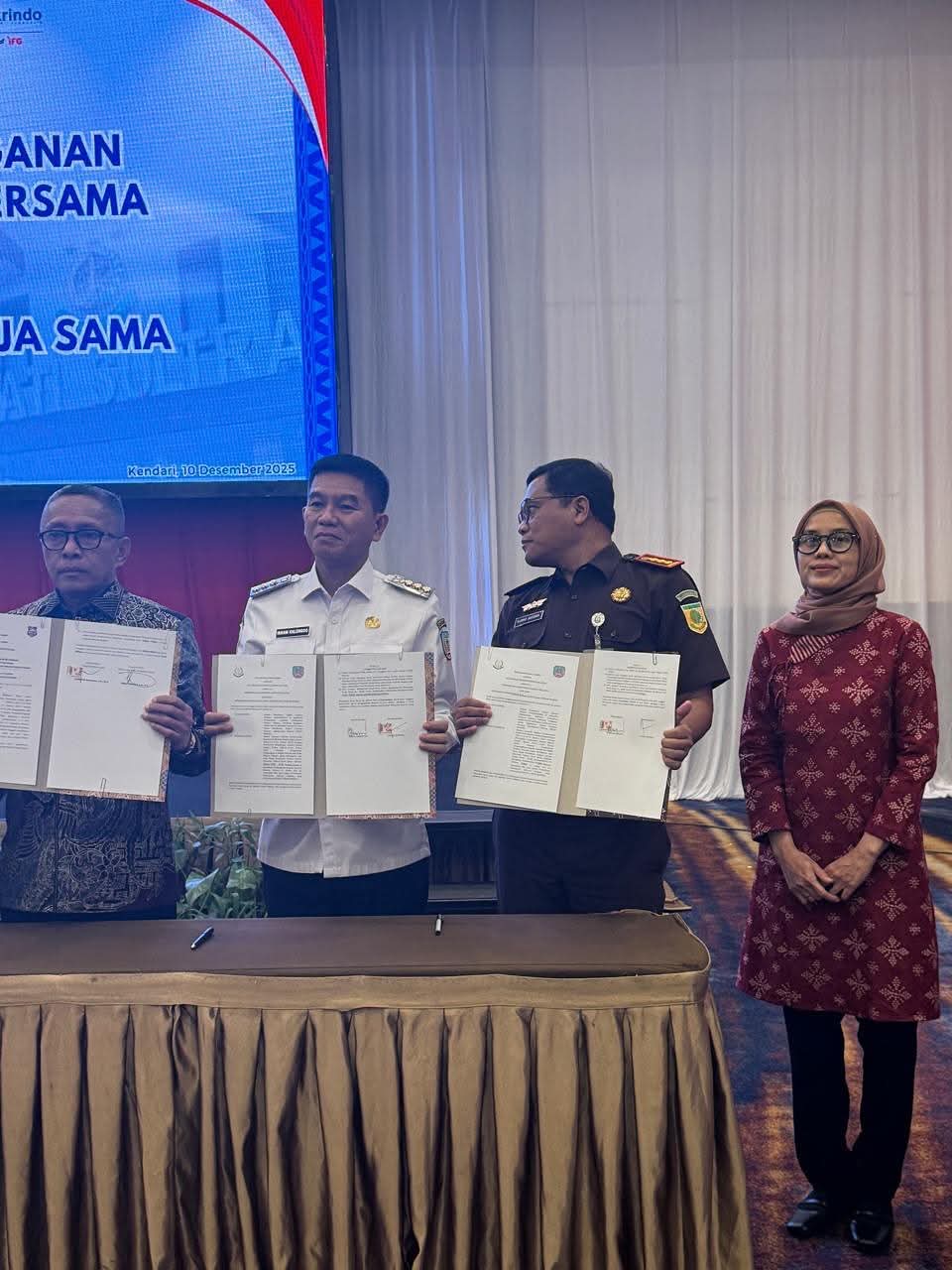 Bupati Konawe Selatan (Konsel), Irham Kalenggo, hadir langsung dan membubuhkan tanda tangannya dalam acara yang berlangsung khidmat di Hotel Claro Kendari, Rabu (10/12/2025).