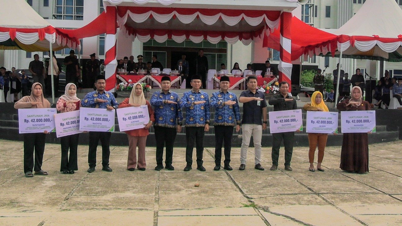 Pada momen upacara tersebut, acara dilanjutkan dengan penyerahan simbolis santunan kematian dari program BPJS Ketenagakerjaan kepada keluarga ahli waris. Bupati dan Wakil Bupati Konsel, didampingi Plt. Kepala Dinas Pemberdayaan Masyarakat dan Desa (DPMD) dan Kepala BPJS Ketenagakerjaan Konsel, menyerahkan bantuan kepada 14 orang keluarga pewaris.